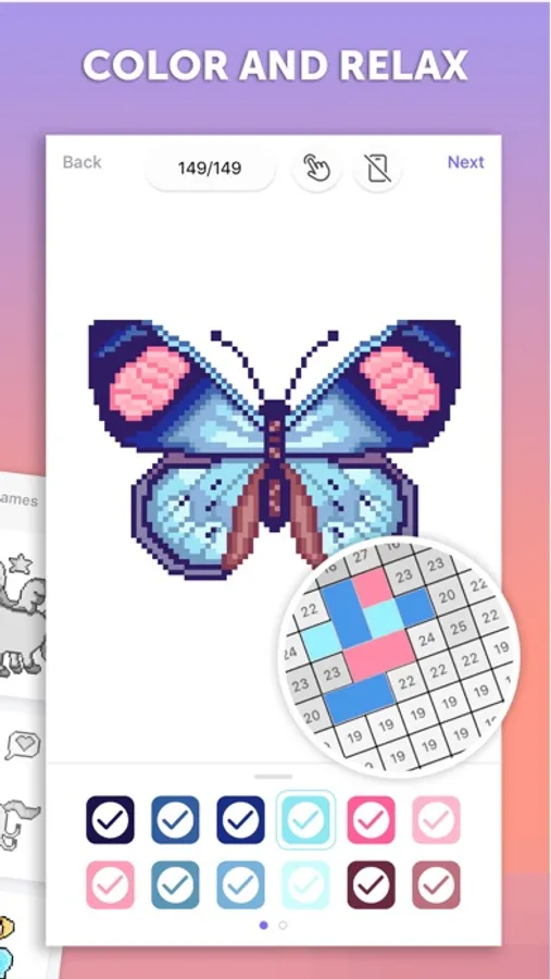 To help you relax and meditate PixelArt plays soothing music while you’re coloring.