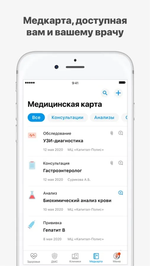 — Анализируйте данные с носимых устройств благодаря интеграции с приложением «Здоровье» и делитесь ими со своим врачом.