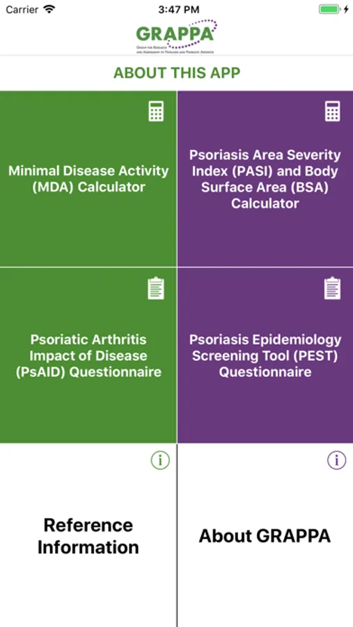 This app from GRAPPA (Group for Research and Assessment of Psoriasis and Psoriatic Arthritis) is designed to support the assessment of patients with psoriatic arthritis and psoriasis. It allows users to calculate a patient’s MDA and assess skin disease (using either PASI or BSA) through specially designed calculators. The app also includes PsAID, PEST and HAQ questionnaires which can be completed directly by patients in a range of languages and a selection of slides from the GRAPPA resources. Visit http://www.grappanetwork.org/ to find out more about GRAPPA.