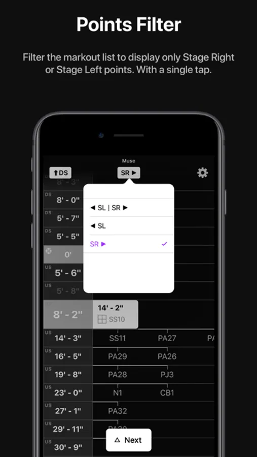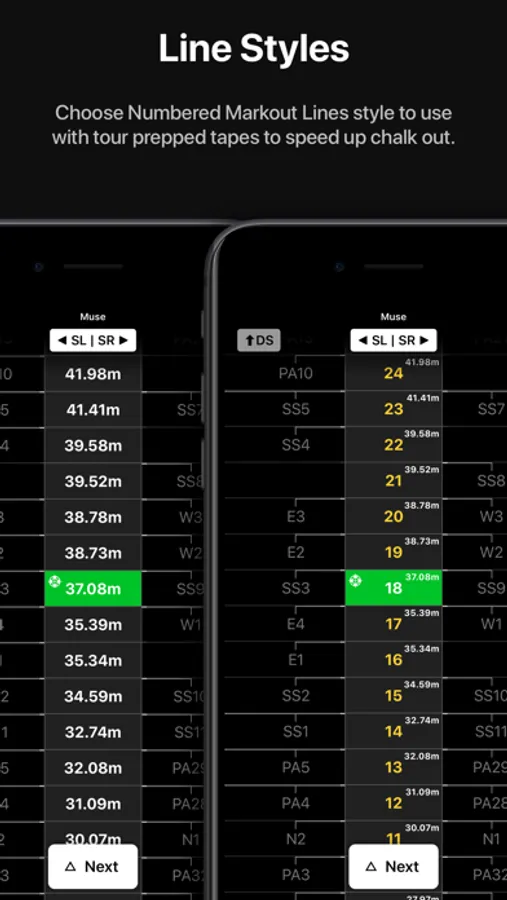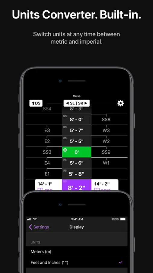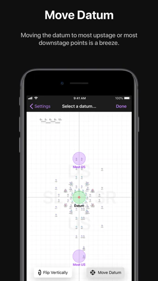Move datum to most upstage or most downstage points with a single tap and save valuable time by eliminating 3 of 6 tapes on the floor.