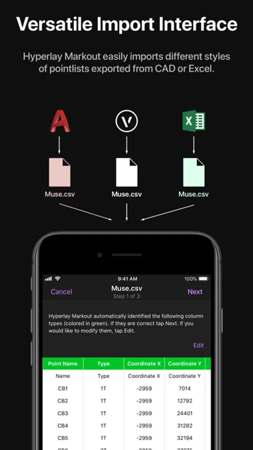 Hyperlay Markout easily imports different styles of pointlists exported from CAD (e.g. AutoCAD, Vectorworks) or Excel. Simply import your show file into Hyperlay Markout from settings and it will do the rest, guiding you through the import process.