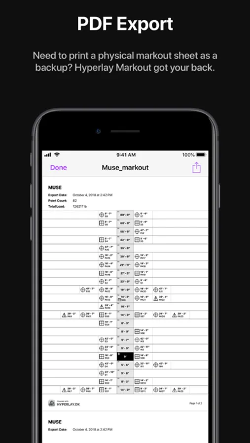 Hyperlay Markout is an innovative rigging app that automates the process of creating a markout list for the rigging industry. Hyperlay Markout does away with markout using a piece of paper, replacing it with an app that is orders of magnitude faster and more efficient all while still being easy to use and familiar to riggers.