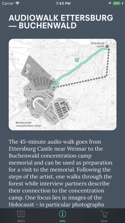 The 45-minute audio walk leads from Ettersburg Castle near Weimar to the Buchenwald concentration camp memorial and can be used as preparation for a visit to the memorial. Following the steps of the artist, one walks through the forest while interview partners describe their connection to the concentration camp. One focus lies in images of the Holocaust - in particular photographs from the liberated camps. The walk ends on arrival at the memorial site.