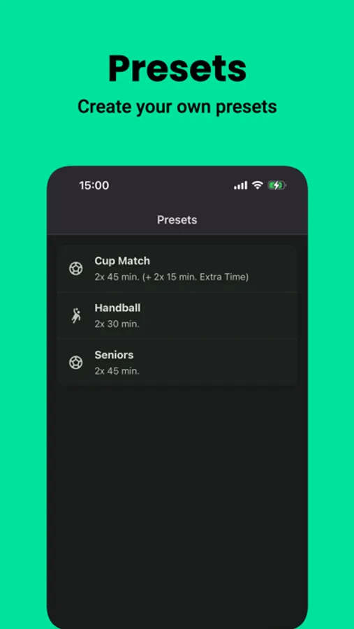 Whether it's American Football, Football, Soccer, Handball, Hockey, Australian Football, Rugby, or any other sport - our app is flexible and versatile. With Referee Watch PRO, you can create custom match presets and thus make time settings for senior and junior matches.