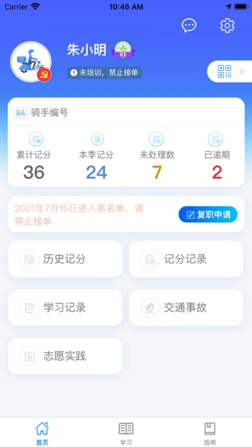 骑手交通文明是一款面向外卖快递骑手的手机应用,骑手通过此应用可以查询到自已的违法记录、记分信息、文明实践记录等信息,并可以在App上进行学习和考试,来抵扣记分。