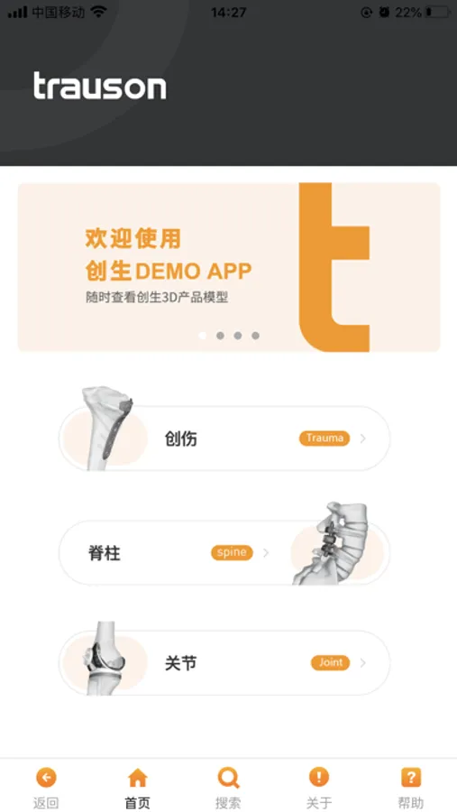 您将获得一个近距离全方位查看创生公司创伤、脊柱和关节所有产品的机会,并且清晰的知晓创生公司产品在人体骨架上所涉及的部位。 支持您自由操作创生公司产品和骨骼的3D模型:切换预设视角,显示或隐藏产品或骨骼,全方位旋转放大缩小。