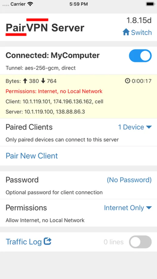 PairVPN is designed in a way that no personal information, password, or security keys are collected or stored remotely. The pairing process ensures your connections stay secure and anonymous even from us. Also unlike normal VPN services, we have no access to your network activities by design.