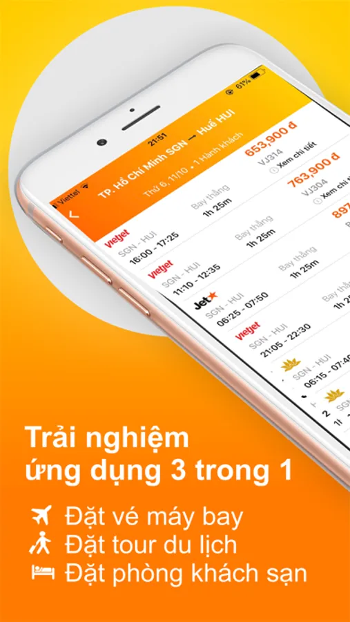 Ứng dụng tích hợp 3 tính năng bao gồm: Đặt vé máy bay, Du lịch & khách sạn, tiết kiệm tối đa thời gian, chi phí cho khách hàng.