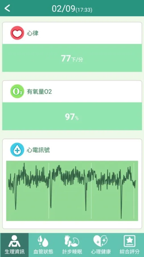 心律、含氧量、微動脈壓力高低值、血管彈性波形圖、心電訊號波形圖的趨勢狀態記錄。
