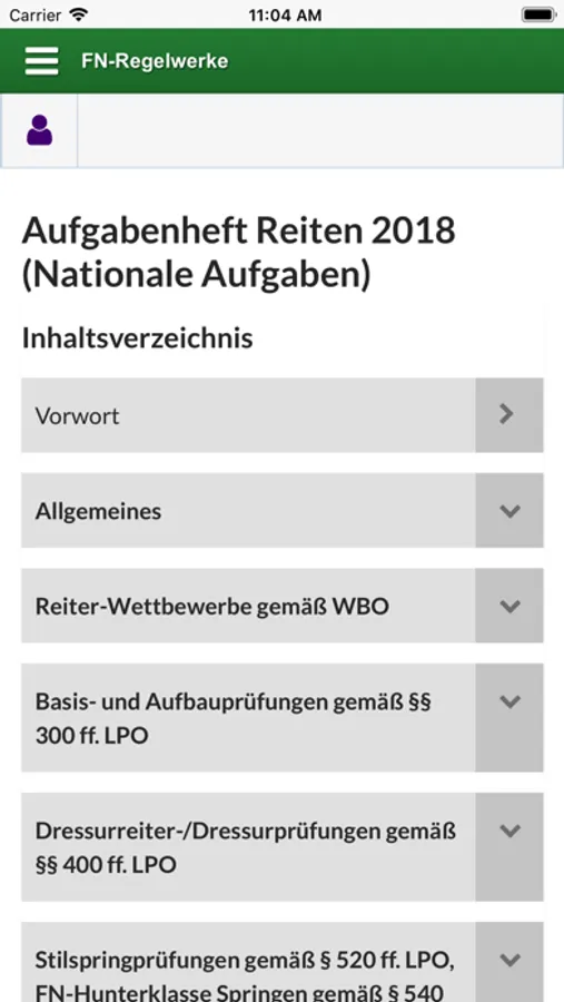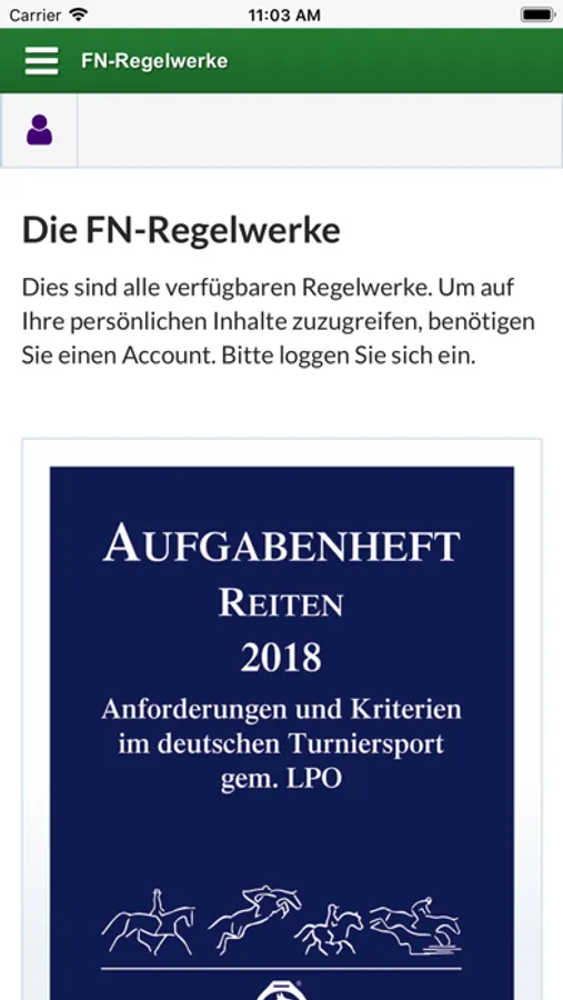 Mit der App "FN-Regelwerke" können Sie jederzeit mobil auf die Leistungs-Prüfungs-Ordnung - LPO, das Aufgabenheft Reiten, das Internationale Aufgabenheft Reiten, das Aufgabenheft Fahren, das Aufgabenheft Voltigieren, die Wettbewerbsordnung - WBO und die Ausbildungs-Prüfungs-Ordnung - APO zugreifen.