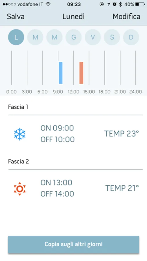 - Weekly timer with 2 daily time periods, with possibility of setting mode and set point for each period.