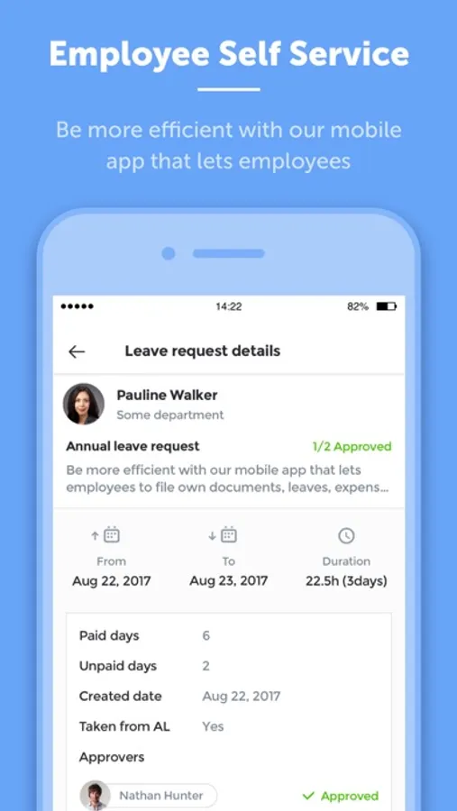 Employee Self Service – Be more efficient with our mobile app that lets employees to file own documents, leaves, expenses, check-ins and check-outs, timesheet hours and payroll data - on the go or from home.