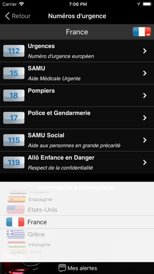 - A des services vous permettant de porter secours, des premiers gestes jusqu’à l’appel des n° d’urgence locaux,