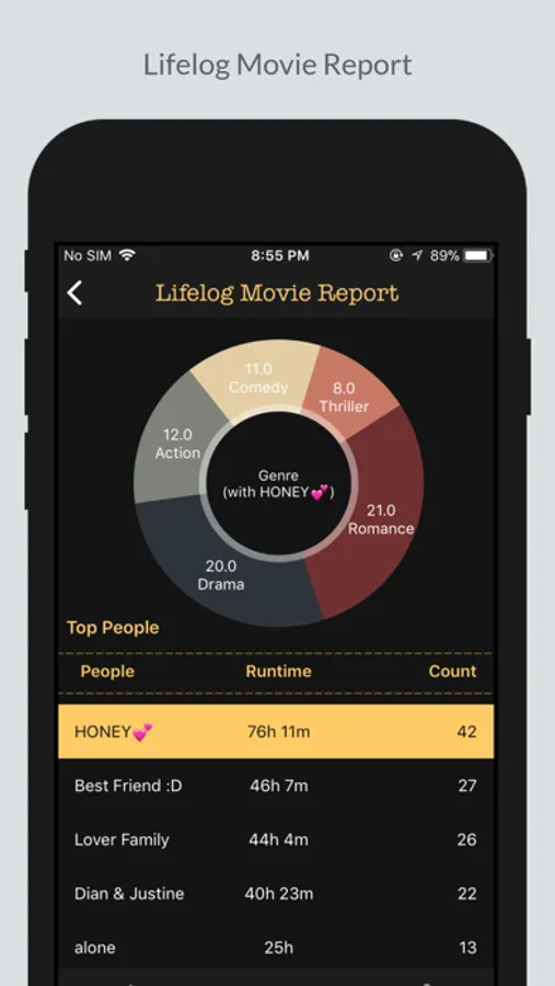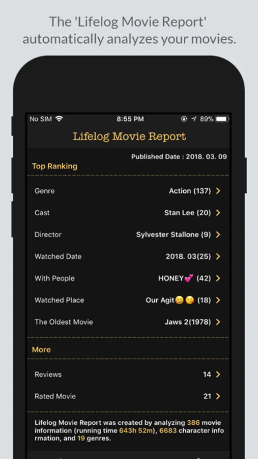 After registering various different movies you've seen, try generating a "Lifelog Movie Report". You can take a look at diverse statistics based on recorded review information and registered movie information.