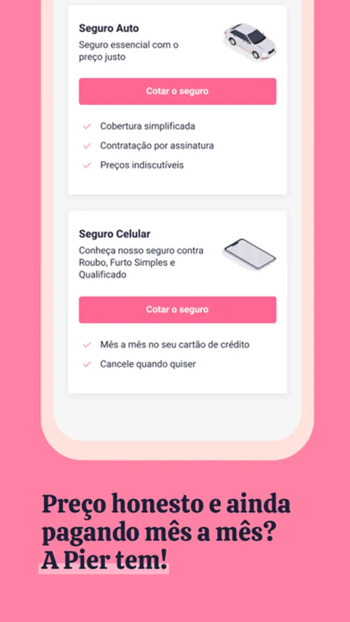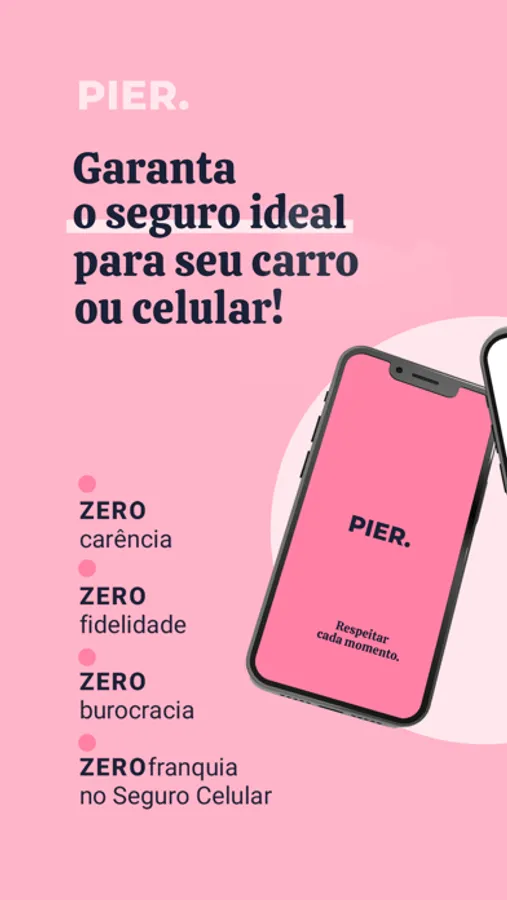 A Pier é a seguradora que respeita você, por isso nós oferecemos seguro para carros e celulares, tudo sem carência, fidelidade ou burocracia.