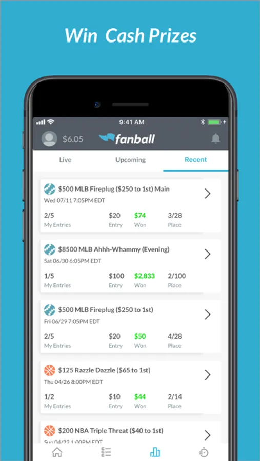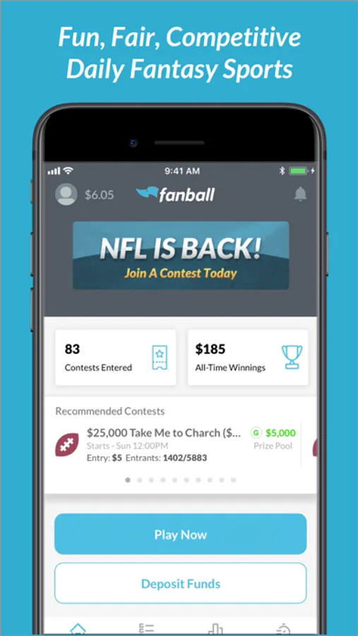 Fanball offers a variety of daily contests and prize structures for your favorite sports, including NFL, MLB and NBA. Play with friends or against the field for REAL CASH with the quickest payouts in the industry.