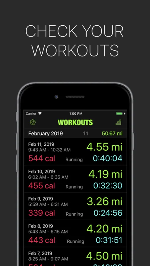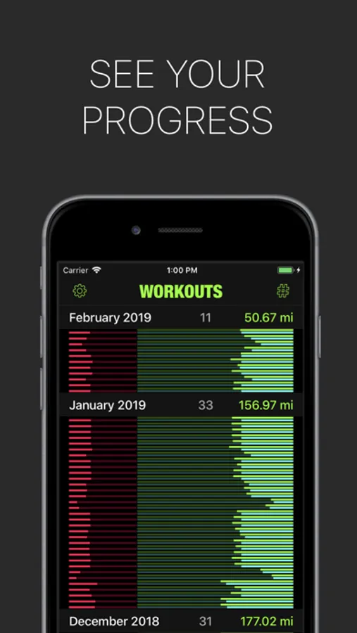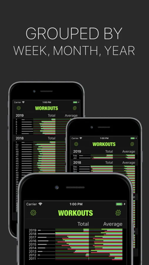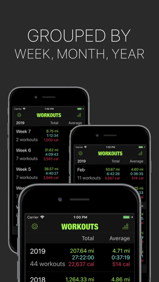 Workouts enables you to track your workout progress by date or grouped by week/month/year to make it easier to see your progress over time.