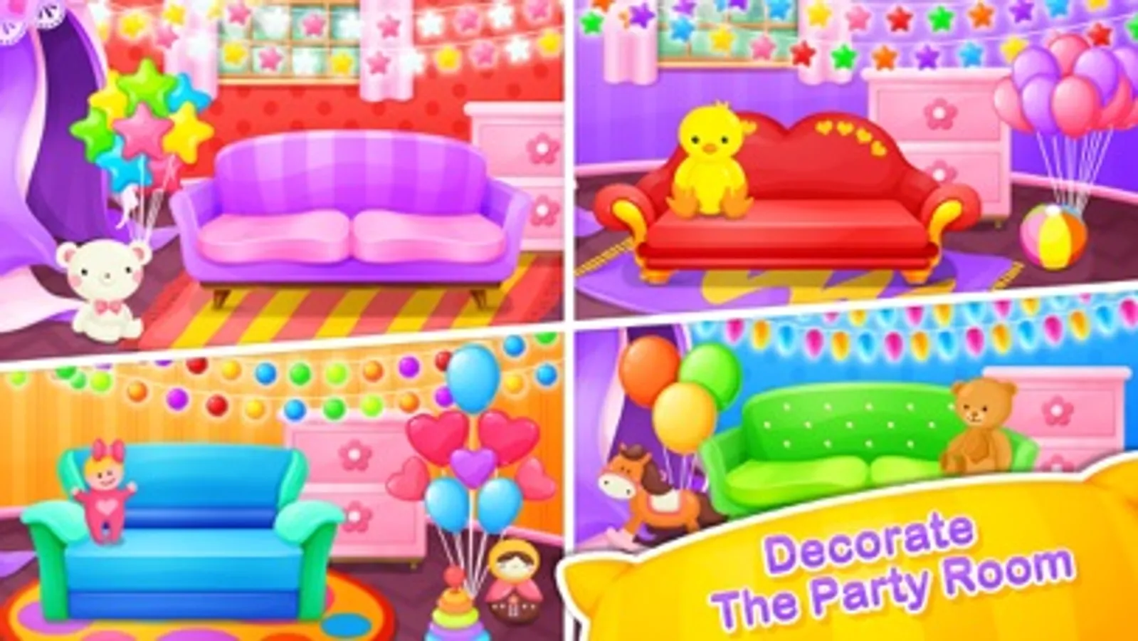 > Decorate the party room in so many colorful balloons and brand new furniture.