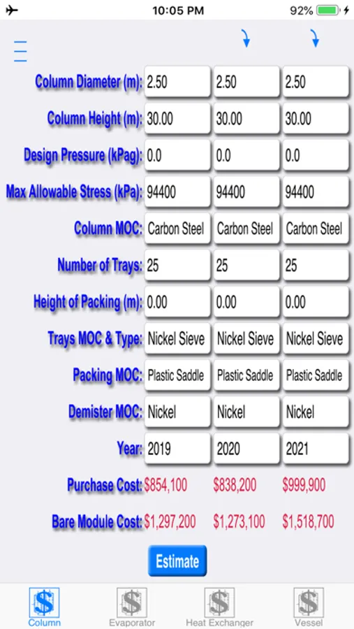 • For each piece of equipment, there are three interactive columns which provide a convenient environment for copy-paste, comparison, and sensitivity analysis.