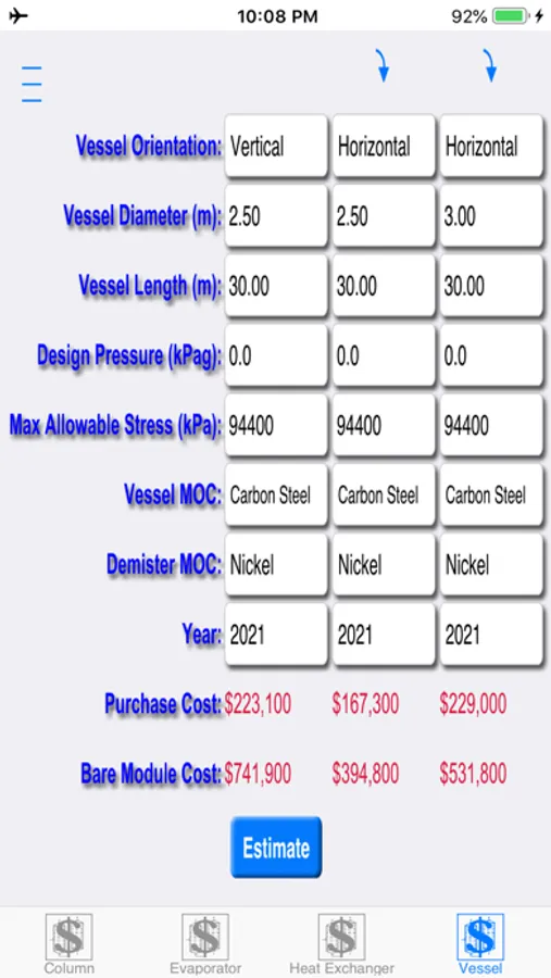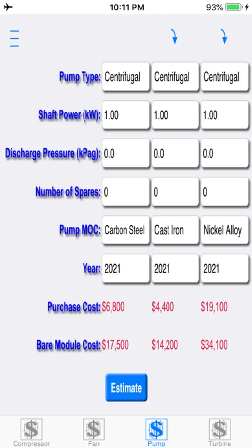 • All affecting parameters, i.e. type, capacity, pressure, temperature, materials of construction, and inflation are taken into account.