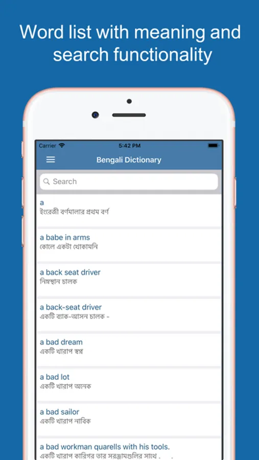 Our new English to Bengali Dictionary and Translator app is a light weight and elegant tool. You can find over 1,18,000+ english words with their Bengali meanings for Free on your smartphone! You can easily search for any word you want and we will take care of giving the meaning of it and the best thing is that you can take quiz to test your knowledge in this Indo-Aryan language.