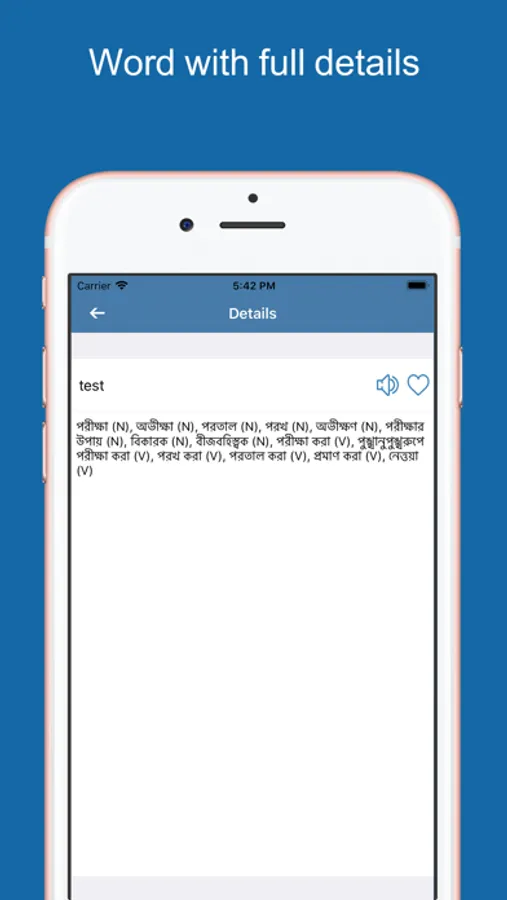 - Want to save a word meaning in the favourites? Tap the heart button and we will add this word automatically in your favourites. You can easily access to it anytime within the favourites choice in the options menu.