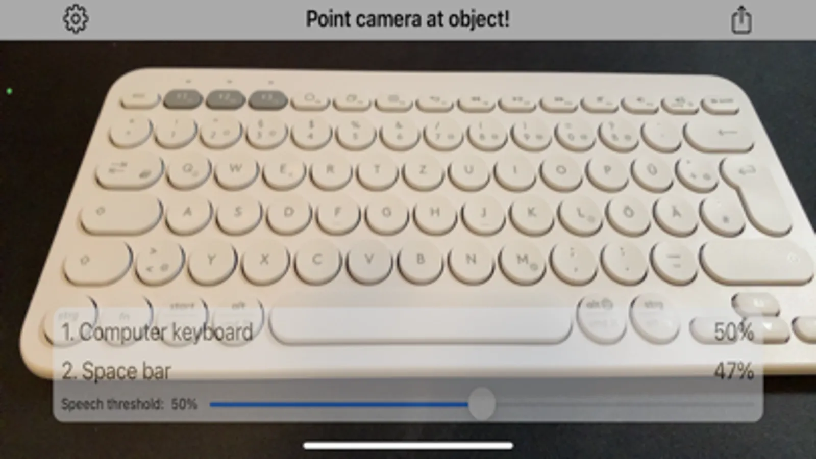 Point your camera to objects. The app will try to detect the object from more than 1000 categories. Try animals, furnishing, household objects, cars, fruits and vegetables. The 1st guess is the most likely object description with the highest confidence. The percentage value of confidence is stated right to the object description.