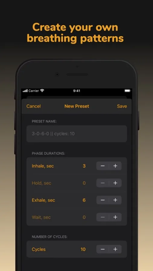 - save your breathing patterns and quickly access them from a context menu on main screen