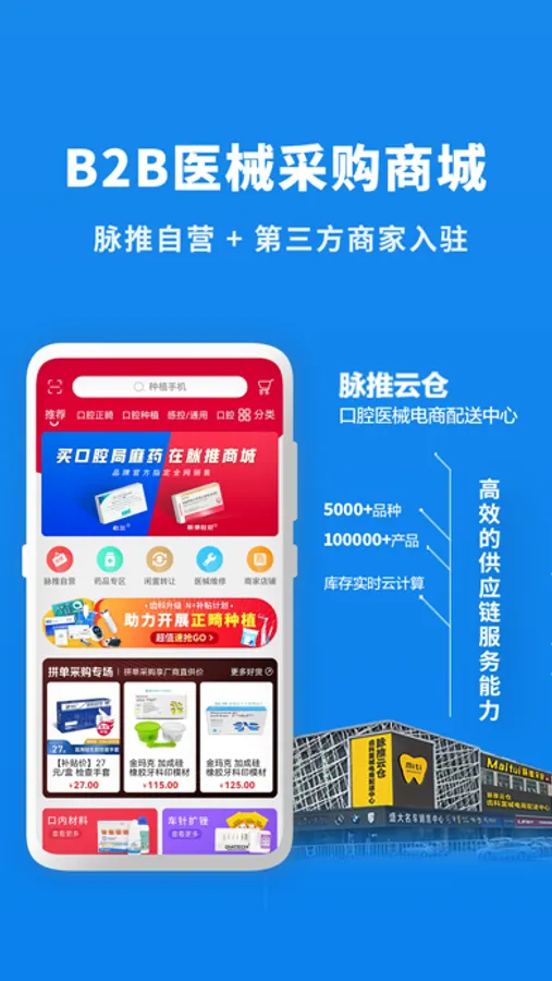 采购商城:数百家商家+脉推自营云仓,共2500多品种、2万多产品,厂家直供口腔医械一站式采购。