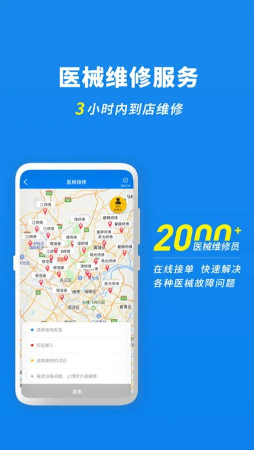 医械维修:全国2000多的维修员在线接单。北上广深一线城市3小时到院服务。