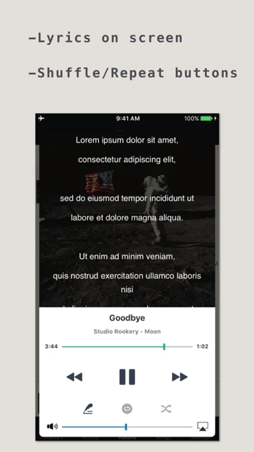 - Play music, repeat and shuffle buttons.