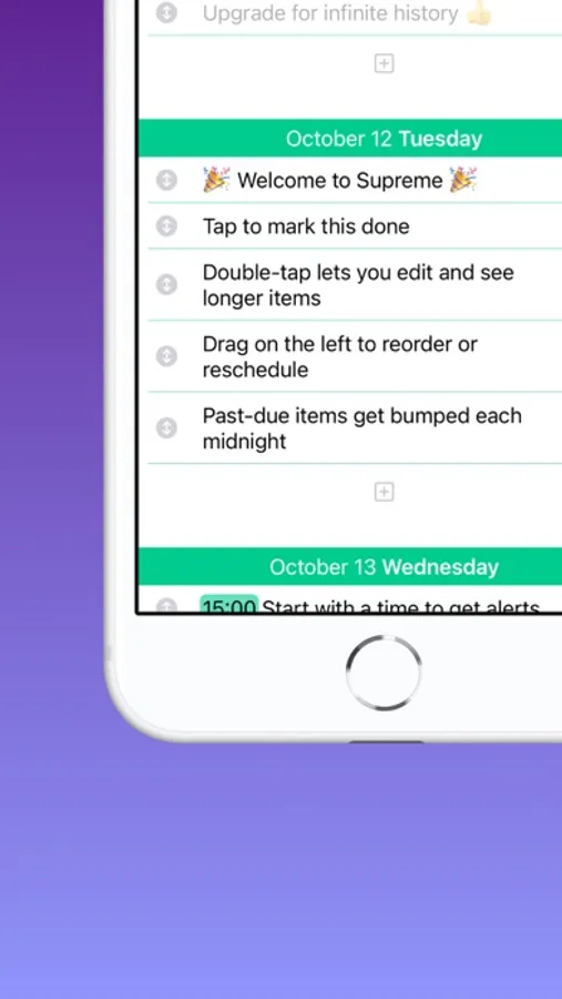 Just scroll through your agenda to see the great things you've done in the past or plan far into the future. Oh, and if you didn't check something off today, Supreme will automatically bump it forward for you. Awesome, isn't it?