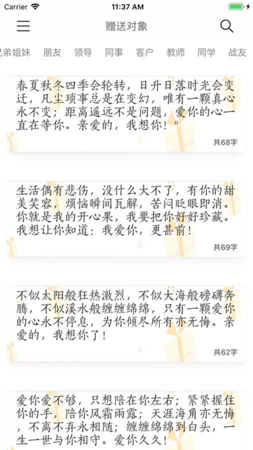 送领导,送长辈,送同事,送朋友,送女友,送老婆,这里总有你要的短信分类,满足您生活中的各种祝福需求。