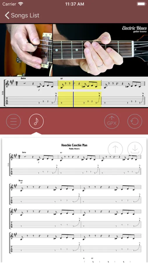 For each lesson, you can view or export the sheet in PDF format and export the file in GPX format to be able to read it with programs like Guitar Pro.