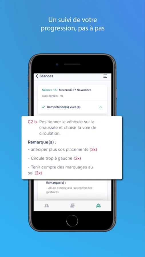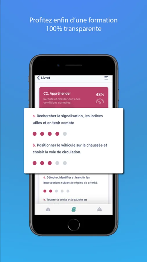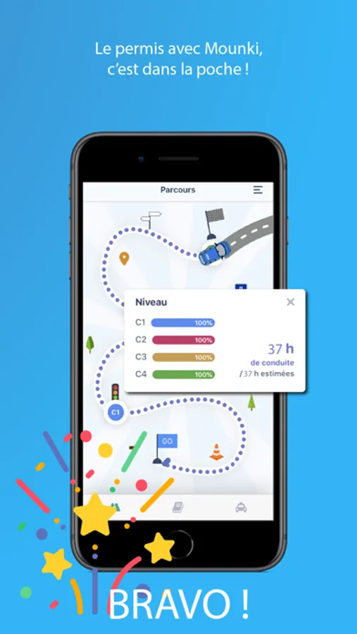 Avec Mounki Copilot en poche, suivez pas à pas l’avancement de votre progression en auto-école. Profitez du premier livret d’apprentissage dématérialisé complet pour être accompagné(e) même en dehors de vos leçons de conduite.