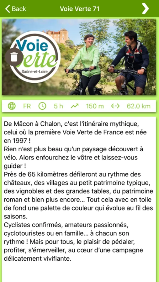 À l'aide d’une carte géolocalisée et interactive, VOIE VERTE 71 vous permet d'avoir une visite guidée du patrimoine naturel, culturel et ferroviaire des voies vertes. A l’approche d’un point d’intérêt touristique, une alerte vous est envoyée et vous donne accès à divers contenus (brefs descriptifs, vidéos, panoramas, liens sites Internet…).