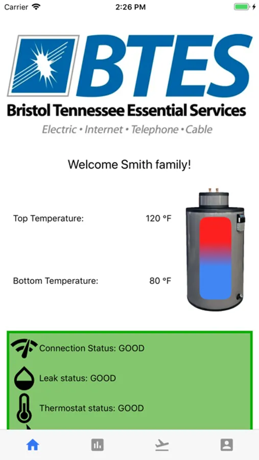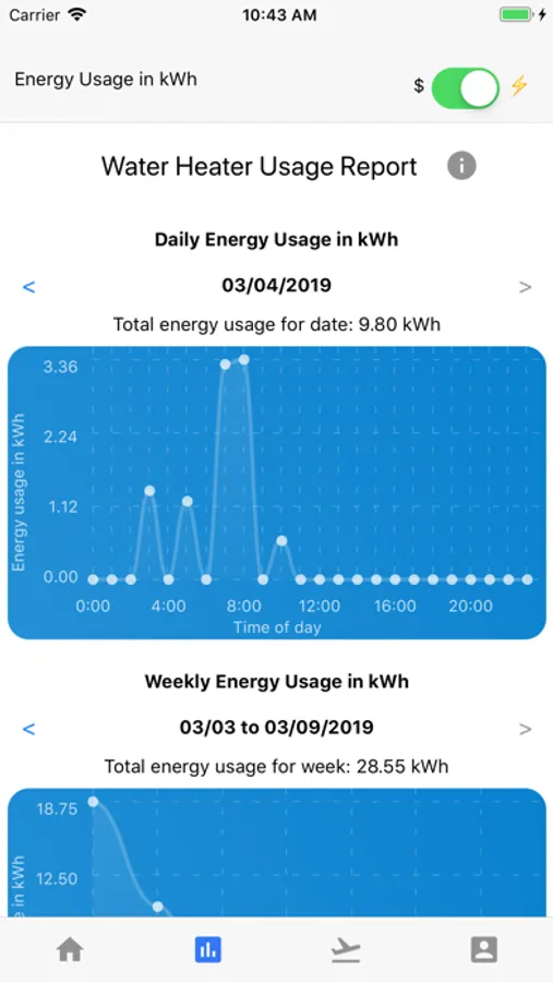 View current tank temperatures and hot water remaining, monitor critical alarms, track energy usage over time*, and remotely put your water heater into vacation mode.
