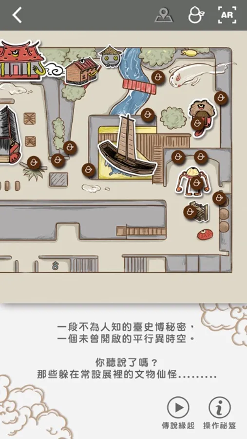 什麼!?臺史博「斯土斯民」常設展居然藏著一個平行異時空?文物仙怪穿越了歷史,遊走在異時空場域裡,他們有自己的故事、有自己的想法,還有話想說!據說,只要採集故事,汲取仙怪的文物能量值,身體就會發生不可思議的升級變化。趕快開啟擴增實境鏡頭,找出這些神秘客的藏匿地點,去看見遊走於時空中的無形之物吧!
