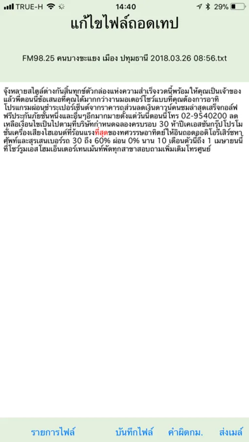 บันทึกเสียงโฆษณาจากรายการวิทยต่างๆ แยกตามจังหวัด อําเภอ และชื่อสถานีพร้อมความถี่วิทยุ จัดเก็บข้อมูลเสียง ข้อมูลสถานีวิทยุที่บันทึกเสียง วัน เวลาที่บันทึกเสียง นําเสียงไปถอดเทปเป็นข้อความ และตรวจสอบข้อความที่ถอดเสียงได้ว่ามีการโฆษณาเกินจริงหรือไม่