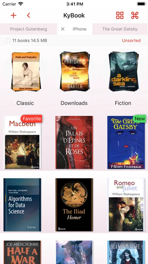• Grouping by categories: by authors, subjects, sequences, publishers, tags, popular, recent, new, unread, reading and finished.