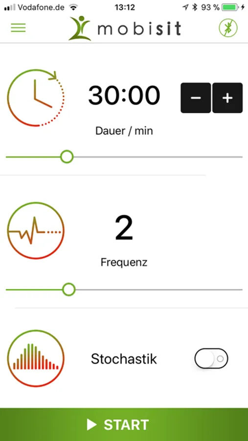 Ebenso haben Sie die Möglichkeit mit der Stochastikfunktion einen Zufallslauf zu aktivieren. Ihr mobisit erhöht oder verringert willkürlich die Geschwindigkeit um zwei Hertz, beginnend von der gewählten Startgeschwindigkeit.