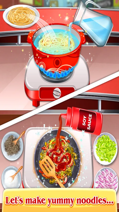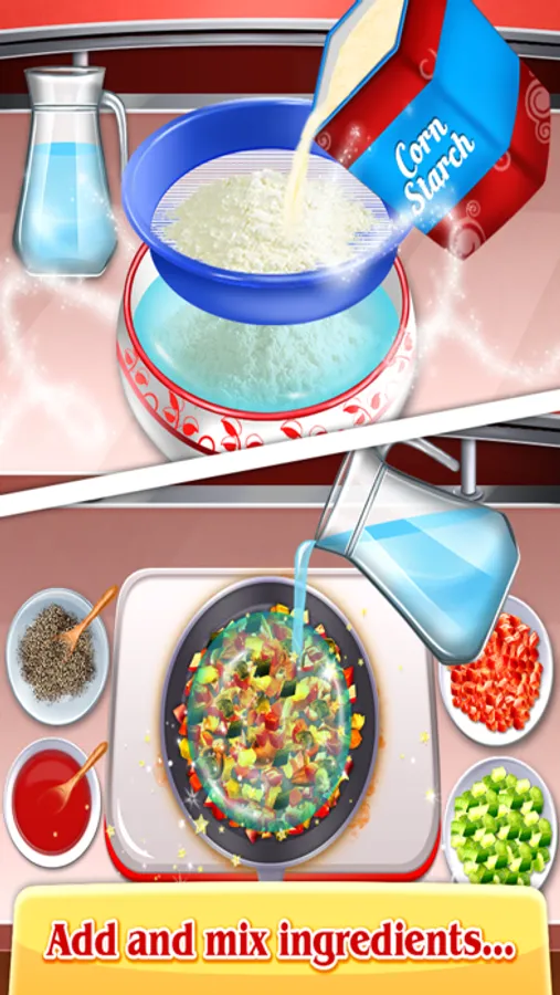Make Chinese food in just a few simple steps and easy to use tools! Using simple controls to prepare your ingredients and mix them all properly and cook with oil or butter. It'll take some times to cook well! You can also decorate ready dishes with lots of different toppings and side dishes.