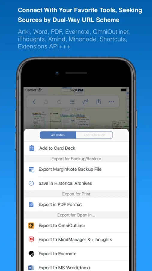 - Export all the margin notes, MindManager, Outline and Pages to a printable PDF;