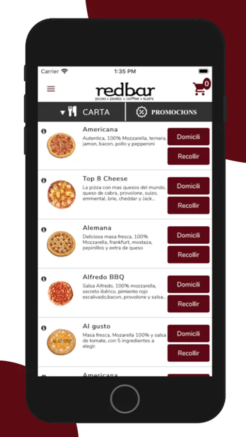 Con nuestra app podrás elegir entre una amplia variedad de pizza, pasta, sushi, ensaladas, deliciosos postres...