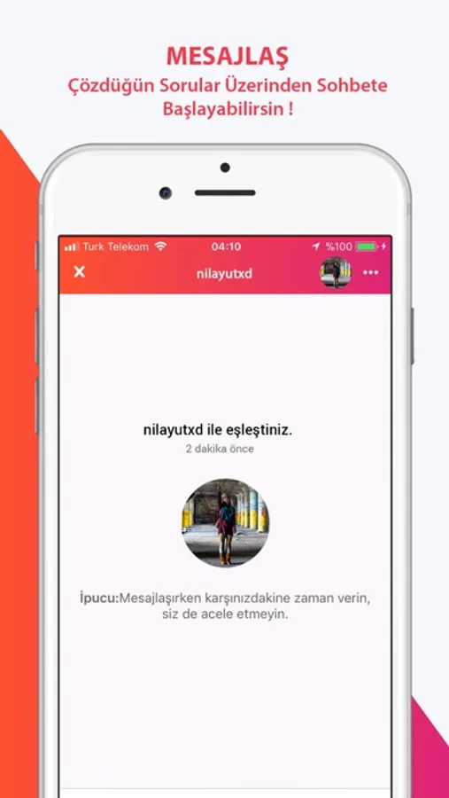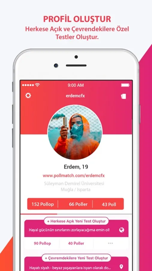 Sizinle aynı düşüncedeki kişilerle eşleşebilir ve sohbet edebilirsiniz. Çevrenizdeki kişilerin testini çözebilmek için sizde test oluşturmalısınız.