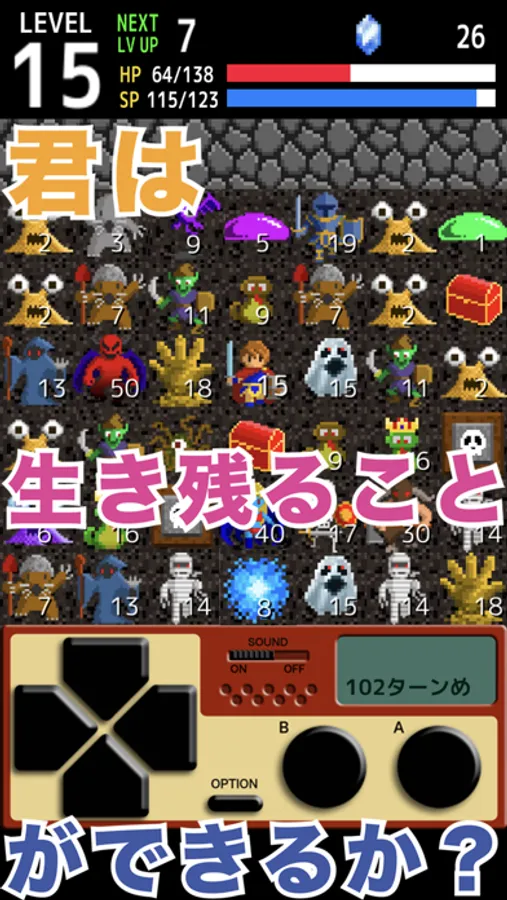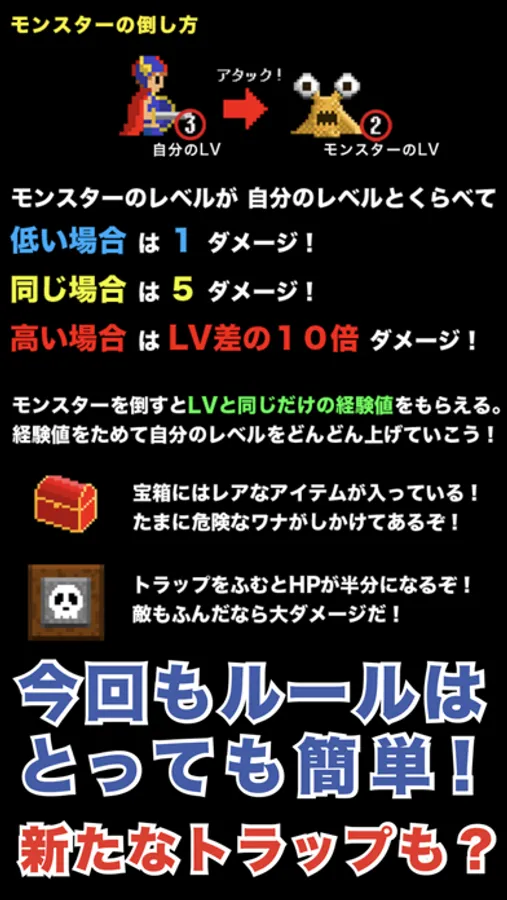 ルールは簡単。自分より強い敵からは大ダメージを受けるので、なるべく弱い敵と戦いながらレベルを上げて魔王を倒そう!