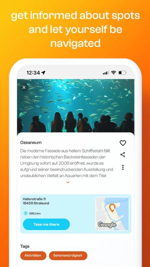 Your life is full of possibilities and ideas: funny, original, grandiose or simply important. livetain is the platform where they all have a place. Be inspired by the many spot ideas on livetain or create your own spots and share them with friends. The special feature of livetain is the monitoring: livetain actively reminds you when you get close to your favourite spots and you receive a notification in the lock screen. You can call up livetain directly via the hint and view the remembered location. The automatic connection with your navigation app shows you the way. You determine the distance at which you receive a message, depending on whether you are travelling on foot, by bike or by car.