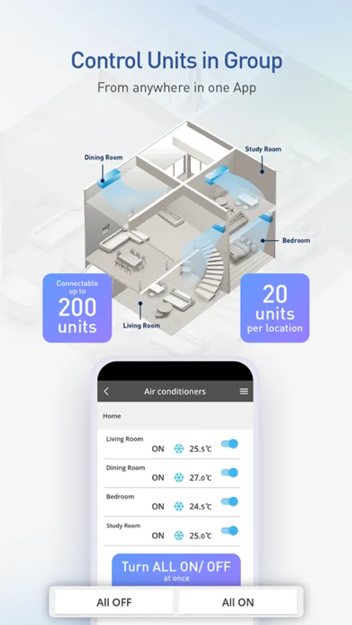 - Turn on or off all air conditioning units and ventilation units at once by each group
