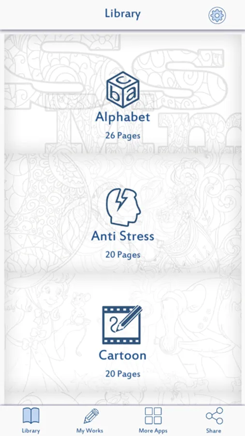 12 different categories such as the alphabet, farm animals, mandala, places, cartoon etc