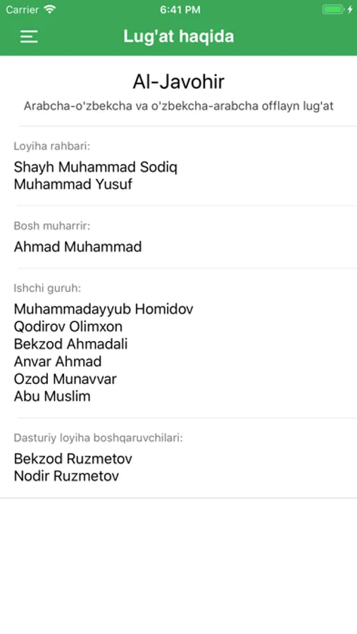 Мана сизларга ал Жавоҳир номли арабча ўзбекча русча луғатни тақдим қилиш ниятида турибмиз. Ҳар бир нарсанинг тарихи бўлгани каби ушбу луғат китобининг ҳам ўзига хос тарихи бор. Бундан тахминан тўрт йил муқаддам олдин устозимиз шайх ҳазратлари арабча ўзбекча бир луғат тайёрлашимизни маслаҳат бериб, ушбу ишни бошлашимизга дуо қилгандилар. Бизлар Аллоҳга таваккал қилган ҳолда, Унинг фазлини сўраб ўта масъулиятли ишга киришдик. Китоб тугагач, ушбу луғатга нима ном қўйиш ҳақида маслаҳат қилсак шайх ҳазратлари "ал Жавоҳир", яъни "қимматбаҳо тош ва дур", деб номладилар ва бу луғатнинг ичидаги ҳар бир сўз Қуръонда ишлатилган сўзлардан ташкил топгани учун дур кабидир, деб қўшимча қилдилар. Китоб ниҳоясига етгач islom.uz порталининг ҳар икки ҳафтада бир бўладиган 9 март душанба кунги мажлисида луғат иши тугагани шайх ҳазратларига хабарини берсак, дуо қилиб, уни андроид тизимига жойлашимизни маъқулладилар. Афсус, эртасига сешанба 10 март куни шайх хазратлари Аллоҳнинг азалда ёзиб қўйган тақдирига мувофиқ боқий ҳаётга риҳлат қилдилар. Устоз билан охирги суҳбатимиз шу луғат хусусида бўлди. Мана ниҳоят ундаги техник камчиликлар ҳар ҳолда бартараф қилиниб, бугун Аллоҳнинг фазли ила сизларга тақдим қилмоқдамиз. Ушбу луғат хато ва камчиликлардан ҳоли дейишдан йироқмиз. Иншааллоҳ кейинги босқичларда яна ҳам мукаммалроқ ҳолда ҳавола қилишни Аллоҳдан сўраб қоламиз. Бу iOS учун версия бўлиб, 40 000 дан кўпроқ сўзни ўзида мужассам қилган. Бу ишда бизга яқиндан ёрдам берган Муҳаммад Айюб Ҳомидов, Олимхон Қодиров, Бекзод Аҳмадали, Бекзод Рузметов ва Нодир Рузметовларга ташаккуримизни изҳор қиламиз.